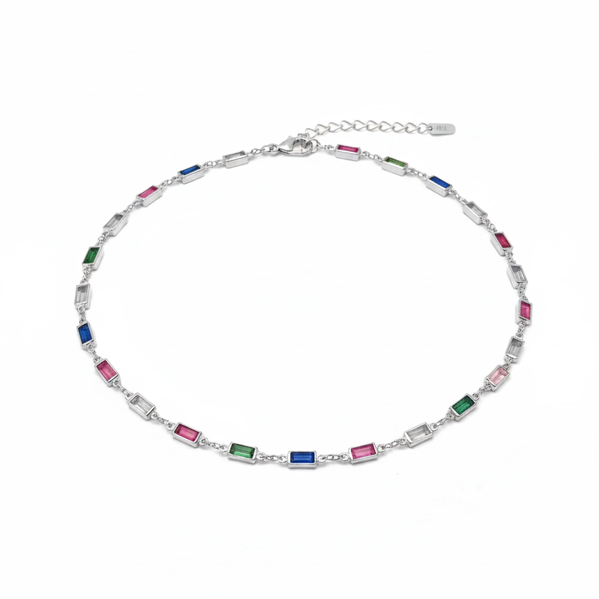 Choker Baguetes Coloridas é o acessório perfeito para transformar seu look com as pedras coloridas que estão super em alta neste verão. Esta peça vibrante e delicada adiciona um toque de cor e elegância, ideal para quem quer brilhar com estilo e personalidade.