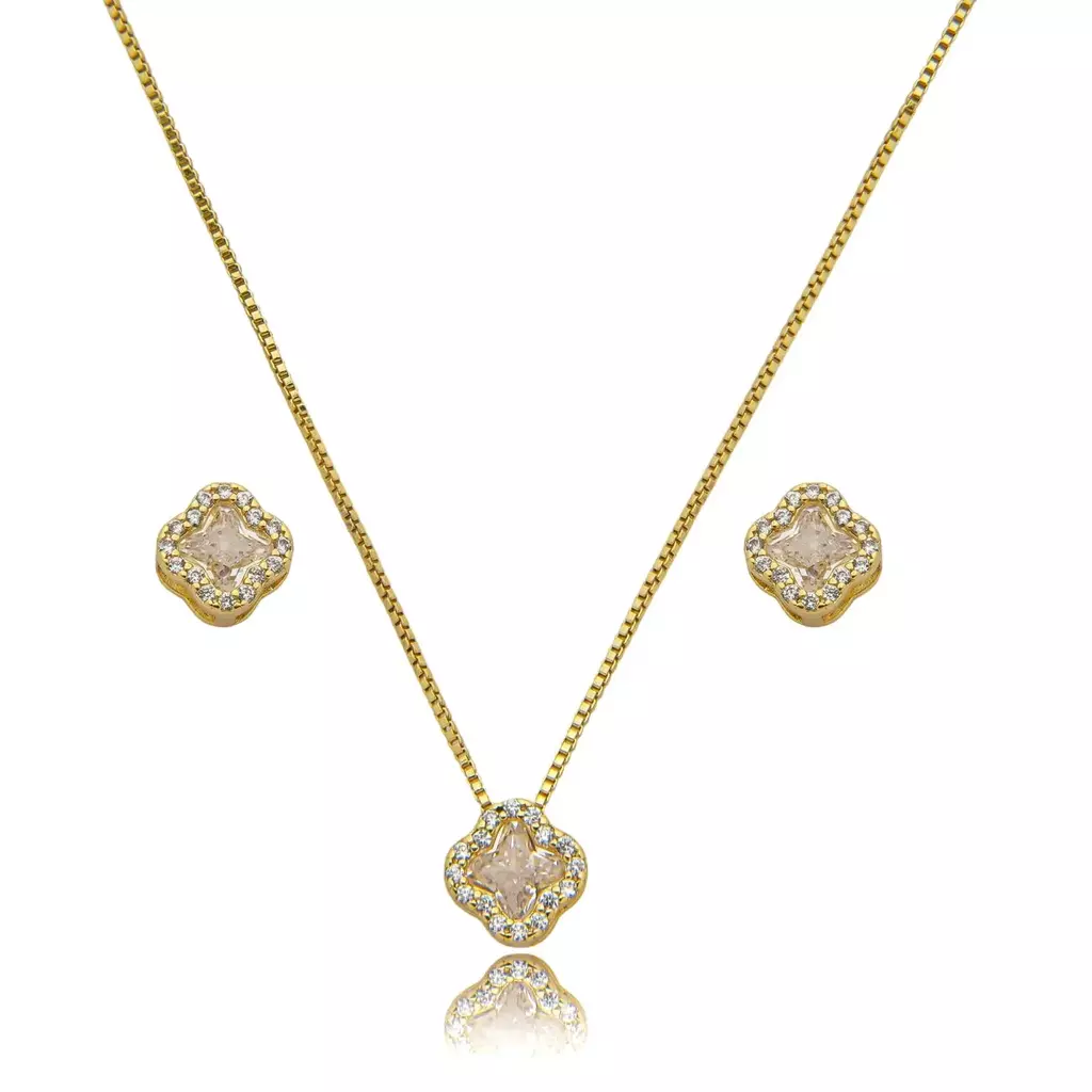 Este conjunto deslumbrante conta com um colar e brinco com trevo cravejado em zircônia cristal, rodeado por micro zircônias que realçam seu charme. Perfeito para quem busca sofisticação com um toque de sorte e delicadeza. Hipoalergênico, com banho de alta durabilidade, garante conforto e resistência. Encante-se com essa peça única e eleve seu estilo com brilho e exclusividade!